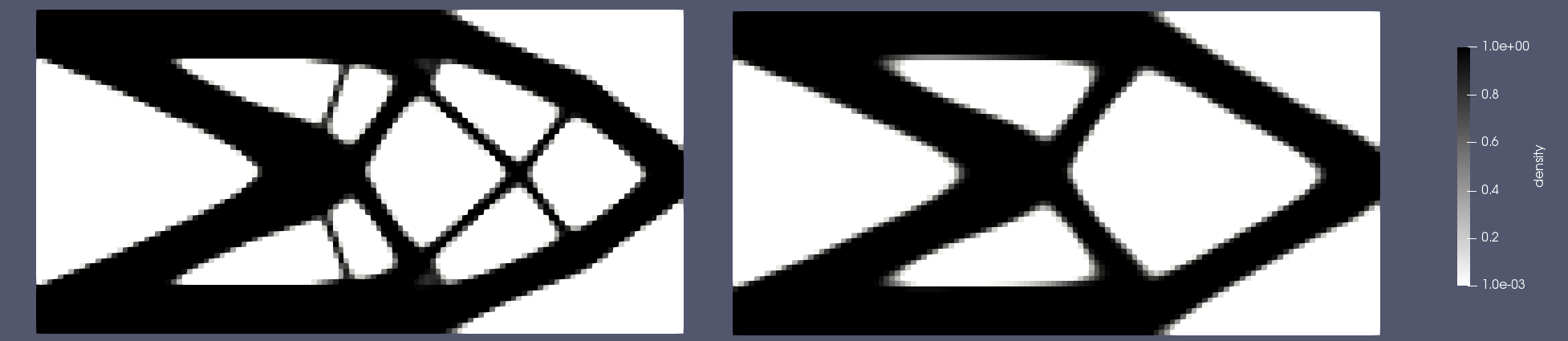 3.956022 seconds (2.22 M allocations: 2.007 GiB, 2.86% gc time, 1.34% compilation time)We observe, that the stiffness for the lower value of $ra$ is higher, but also requires more iterations until convergence and finer structures to be manufactured, as can be seen in Figure 2: