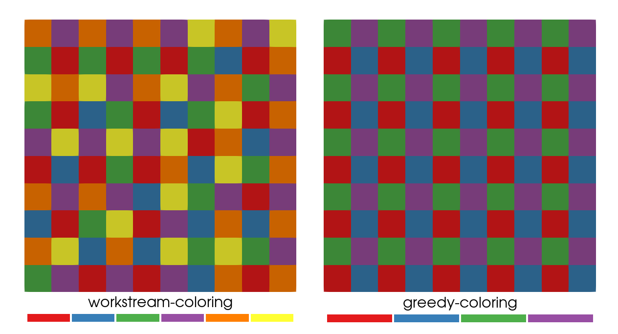 There are two coloring algorithms implemented: the "workstream" algorithm (from Turcksin et al. [12]) and a "greedy" algorithm. For this structured grid the greedy algorithm uses fewer colors, but both algorithms result in colors that contain roughly the same number of elements. The workstream algorithm is the default one since it in general results in more balanced colors. For unstructured grids the greedy algorithm can result in colors with very few elements, for example.