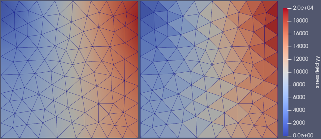 - Constant in each cell (matching the approximation of constant strains in each element). Note that a current limitation is that cell data for second order tensors must be exported component-wise (see issue #768)