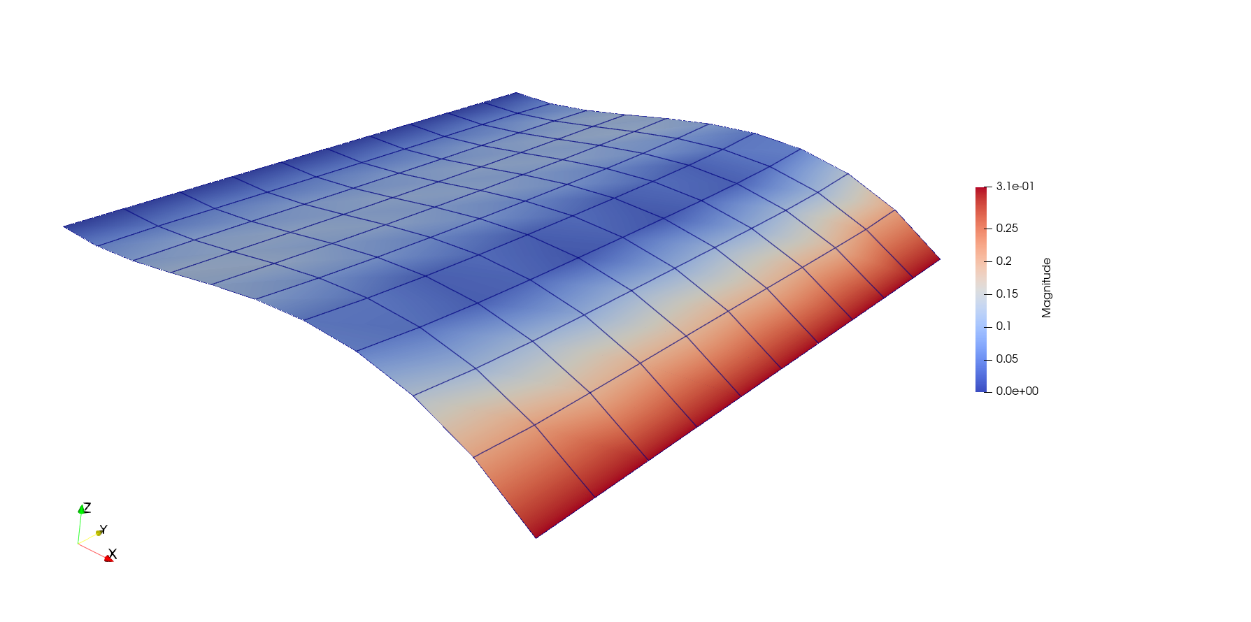 end; #end main functionsBelow is the function that creates the shell mesh. It simply generates a 2d-quadrature mesh, and appends a third coordinate (z-direction) to the node-positions.